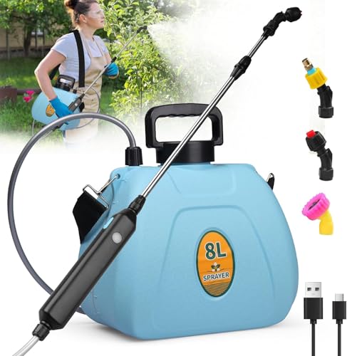 Pulvérisateur électrique 8L/5L de Jardin, avec 3 Buses à Brume, Batterie 1500 mAh Rechargeable par USB, Lance Télescopique et Sangle Réglable,pour Toiture, Pelouse, Cour et Jardin. (5L-Bleu)