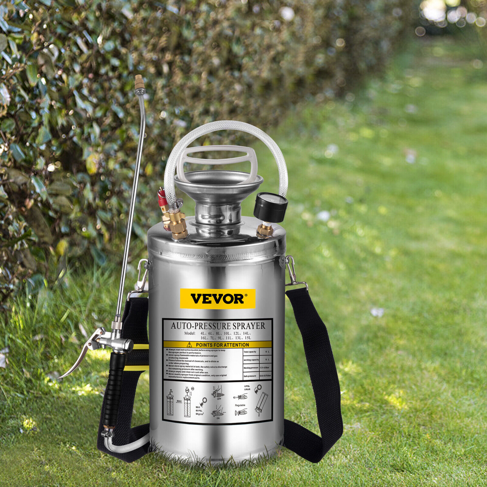 Pulvérisateur de jardin en acier inoxydable VEVOR - À pression préalable - Multi usage - Capacité totale 6 L