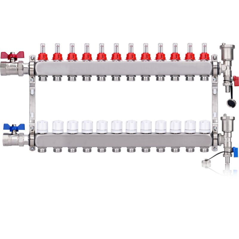 Kit Collecteur Radiateur, 12 Circuits Distributeur Chauffage, avec Vannes à Boisseau Sphérique 1", avec Purgeur Manuel et Débitmètre, Raccords pour