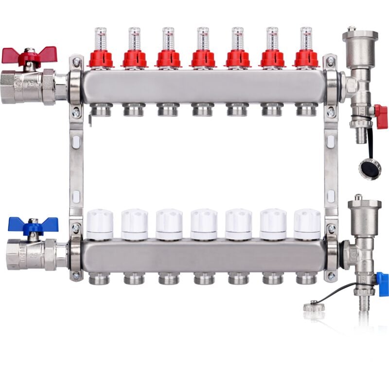 Kit Collecteur Radiateur, 7 Circuits Distributeur Chauffage, avec Vannes à Boisseau Sphérique 1", avec Purgeur Manuel et Débitmètre, Raccords pour