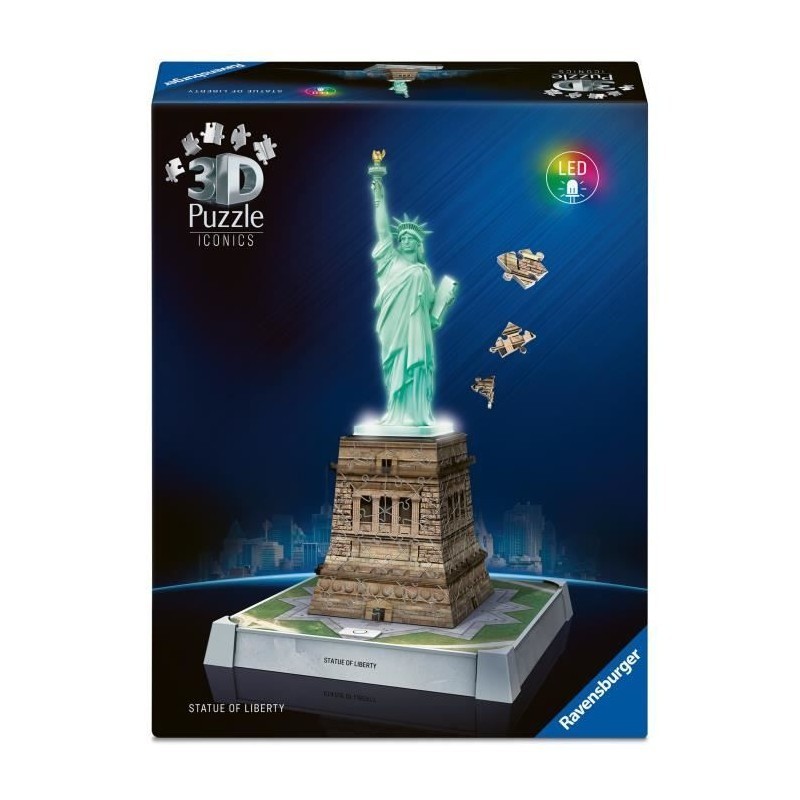 Ravensburger - Puzzle 3D Statue de la Liberté Lumineuse - Monument à Construire sans Colle - 108 Pièces - Socle LED Multicolore - Dès 10 Ans - Lampe Déco - 12008027