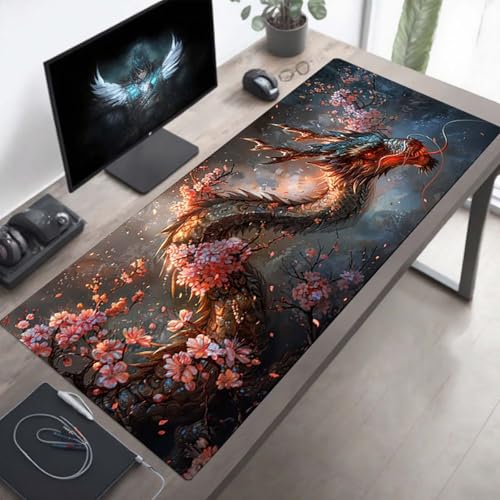 Tapis de Souris XXL 1000x500x3mm, Tapis de Souris Gamer Dragon, Grand sous Main, Base en Caoutchouc Antidérapante, Bords Cousus, Imperméable Mouse Pad Rose, Améliorer Précision PjY14107 P-V