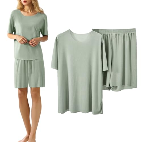 Bastwahl Pyjama Court Femme en Coton à Manches Courtes Ete de Nuit Haut Lot de Deux Ice Silk Larges Jambes Respirant de Couleur Unie Vêtements 2 Pièces 3/4 Pantacourt Sleepwear