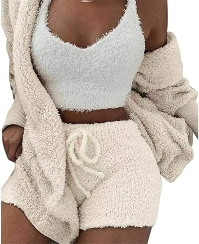 JosuE Misscosy Ensemble en Tricot 3 pièces, Pyjama Sexy en Polaire Chaude et pelucheuse pour Femme, Pyjama 3 pièces (White,Medium)