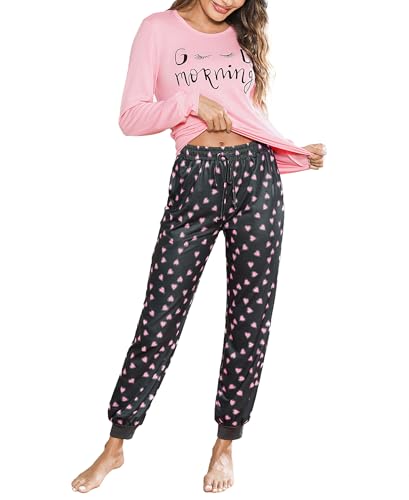 Bresdk Ensembles de Pyjamas Femme Hiver Coton Pyjama Noel Femme n à Manches Longues Vêtements de Nuit à Col Rond Chaud et Doux Deux Pièces Rose S