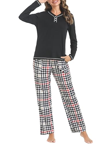 iClosam Pyjama Hiver Chaud Femme Ensemble de Pyjamas 2 Pièces Coton Vêtements de Nuit col V Confortable avec Haut Manche Longue et Bas à Carreaux
