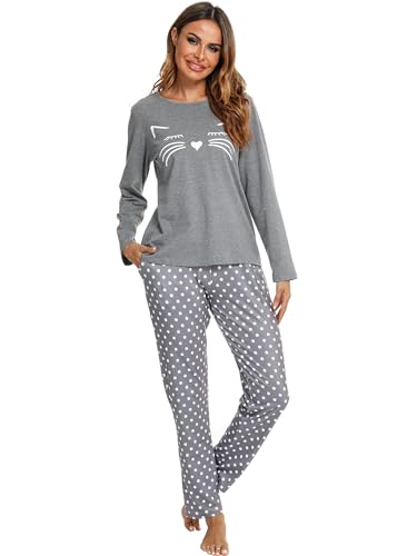 Reliwel Pyjama Femme Coton Pyjama pour Femme à Manches Longues Vêtements de Nuit Femmes Long Ensemble de Pyjama Chat 2 Pièces Doux Confortable Poches Tenue Automne et Hiver S-XXL