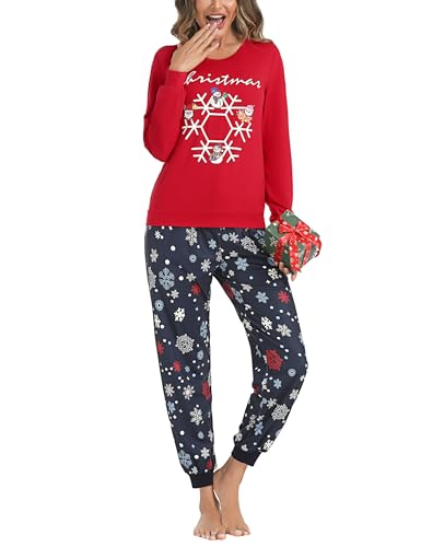 Bresdk Pyjama Femme Hiver Ensemble de Pyjamas Femme Cotton à Manches Longues Vêtements de Nuit à Col Rond 2 Pièces Imprimé Tenue de Nuit Doux Noël Rouge L