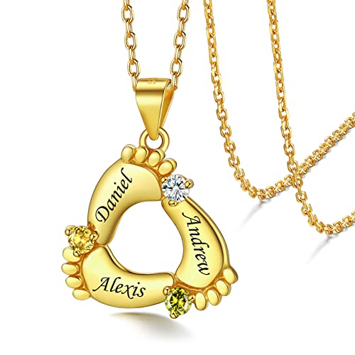 Collier Personnalisé 4 Prenom des Enfants Pied de Bebe Cadeau Maman Femme Pendentif Argent 925 Gravure Chaine Rolo 45cm Pierre de Naissance Bijou Noel Fêtes des Mères Anniversaire Mariage Valentin