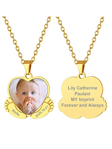 FindChic Collier Photo Personnalisé Pendentif Coeur Pieds de Bebe Prenom des Enfants Cadeau Maman Fêtes des Mères Chaine Femme Acier Gravure Rolo 50cm Bijou Noel