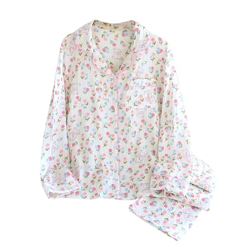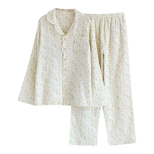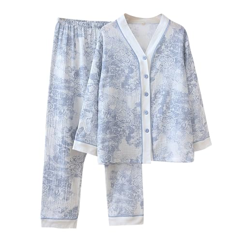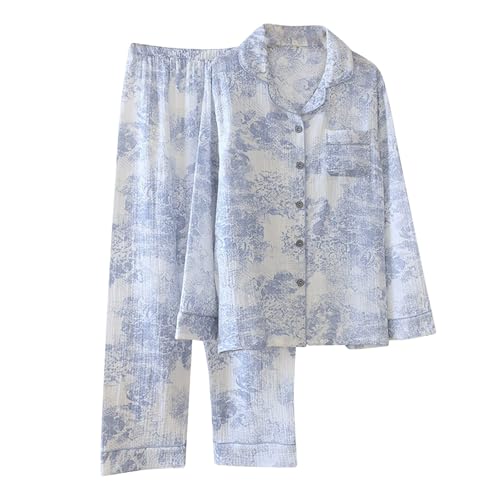 Générique Ensemble De Pyjama Femme Gaze De Coton,Ensemble Pyjama Femme Chic Et Elegant à Manches Longues VêTements De Nuit Deux PièCes Cardigan Col en V avec Boutons Et Pantalon Tenue De Maison