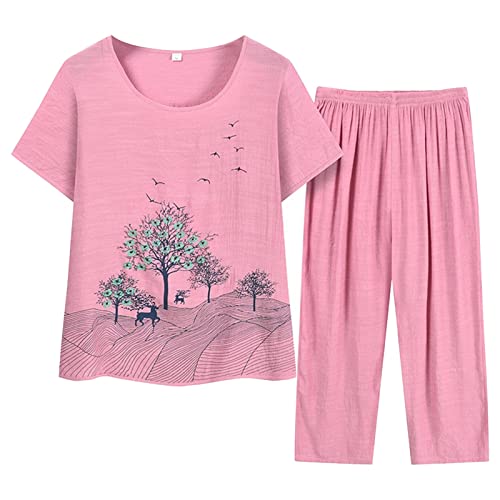 Générique Pyjama en Coton pour Femme,Ensemble Pyjama Femme Chic Et Elegant à Manches Courtes Col Rond Imprimé VêTements De Nuit 2 PièCe Dessin animé Mignons Casual Doux Haut Et Pantalons Capri