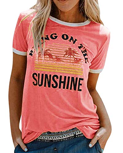 Heekpek T-Shirt Femme Été Chemisier Chic Blouse Col Rond Tops Manches Courtes Grande Taille Coton Imprimé, 1Rose, M