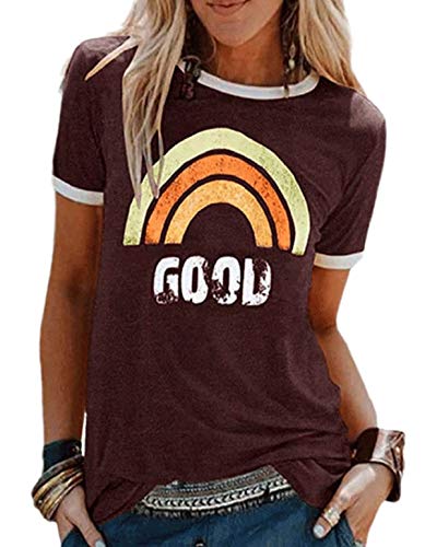 Heekpek T-Shirt Femme Été Chemisier Chic Blouse Col Rond Tops Manches Courtes Grande Taille Coton Imprimé, Bordeaux, L