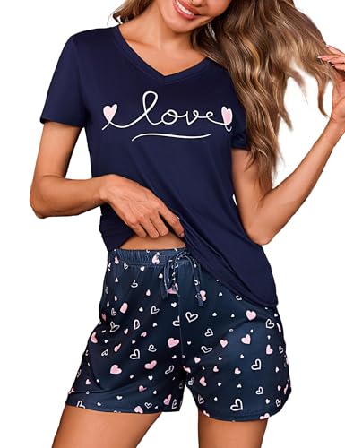 Bresdk Pyjama Femme Coton Ete Ensembles de Pyjama Short à Manches Courtes Vêtements de Nuit d’été col V Tenue de Dormir Sexy Chic Deux Pièces Doux Bleu XXL