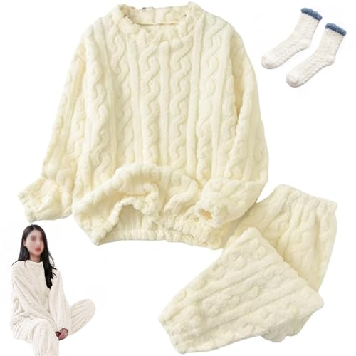 KEYULI Pyjama en flanelle pour femme - Chaud - Hiver - Confortable - Pjs Y2k - Doux et chaud - 2 pièces - Vêtements de nuit moelleux en peluche (beige, taille unique)