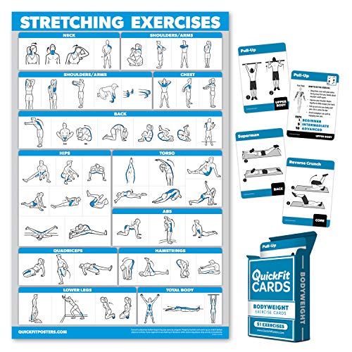 QuickFit Lot de 2 Affiches d'exercices d'étirement plastifiées 45,7 x 68,6 cm et Cartes à Jouer pour Exercices de Poids corporel 6,3 x 8,9 cm