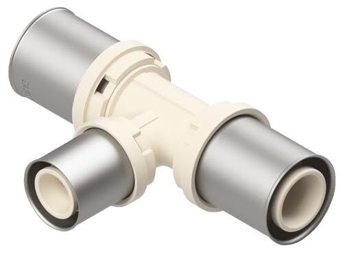 SOMATHERM FOR YOU, Raccord té réduit multicouche PPSU à sertir, résistant à 134°C, avec fenêtre de contrôle et triple joint torique, Ø20-16-20 mm, EN 21003