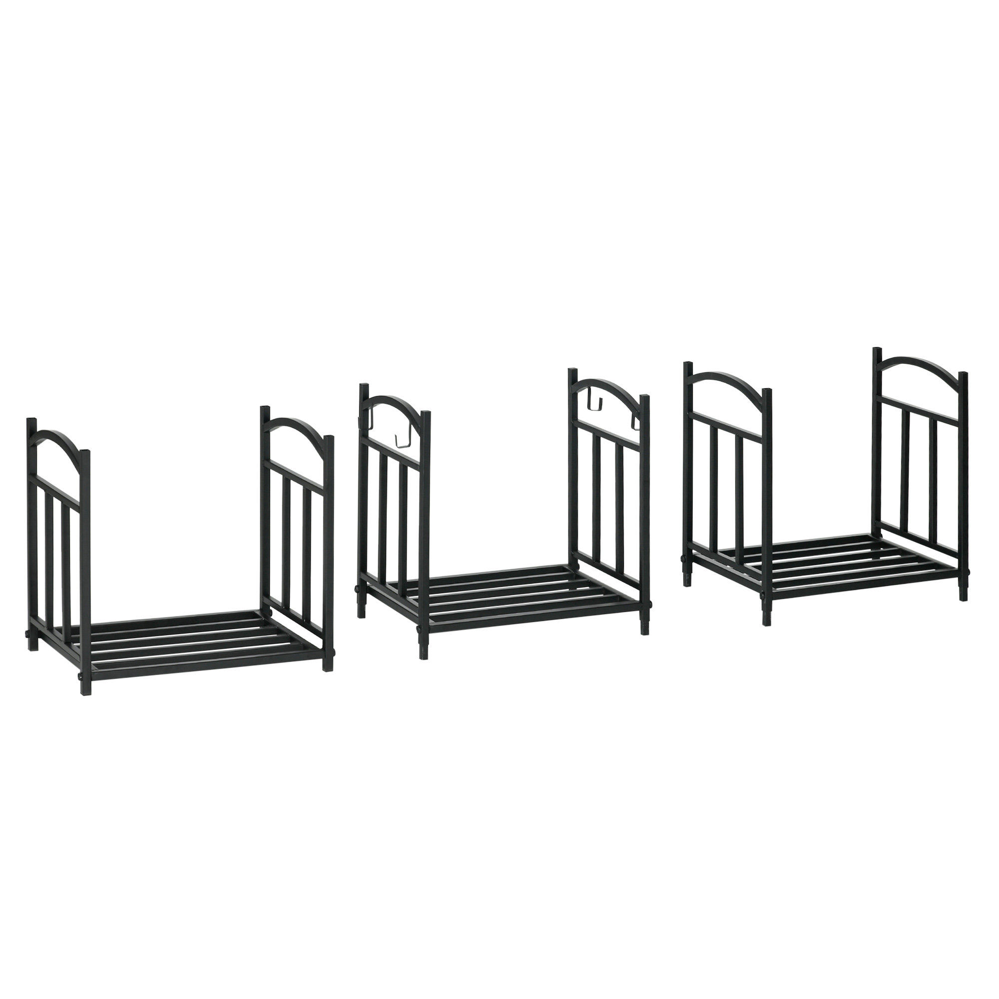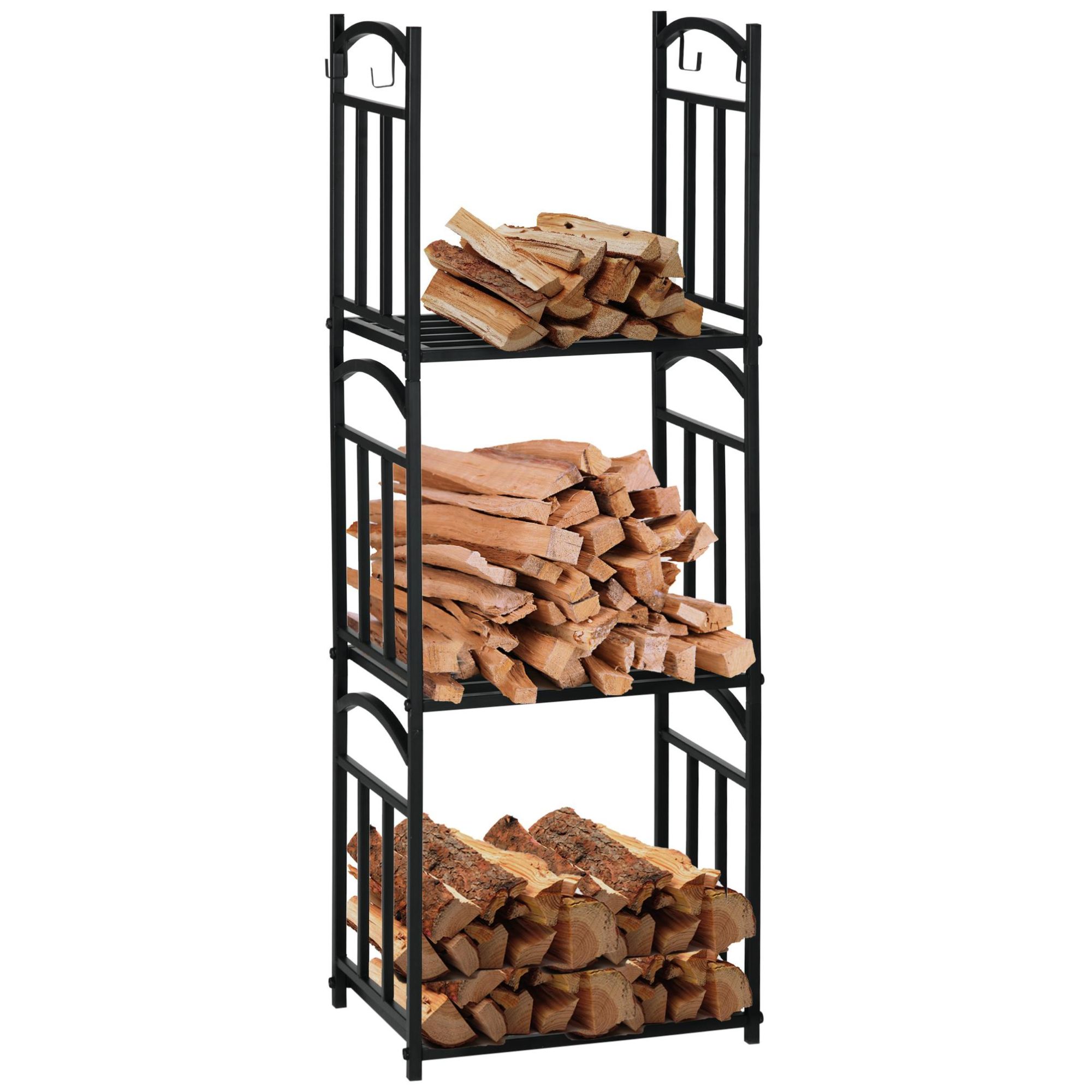 Outsunny Range bûches Porte-bûches range rack à bûches pour bois de cheminée modulable avec 4 crochets, charge 30 kg par plateau, 46 x 32 x 126 cm métal époxy noir
