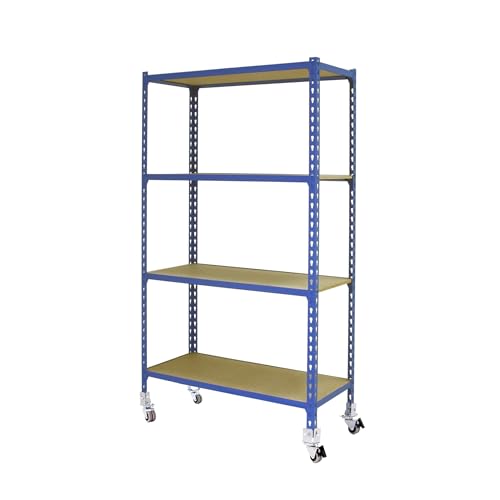 Simon Rack Étagère Rangement en Route à 4 Niveaux en Boix, 75 kg Capacité de Charge et Point de Flexion, 1575x900x500 mm, Étagère Charge Lourde, Étagère Garage, Bleu/Bois - Maderclick