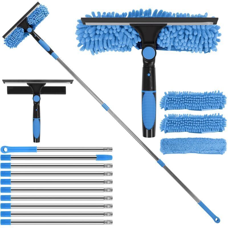 MEKOTRIN 4.5M Raclette à Vitre avec Manche Télescopique, 3-en-1 Kit de Nettoyage Vitre Professionnelle avec Raclette en Silicone & Brosse en Microfibres pour Voiture Fenêtre Hautes(Bleu)