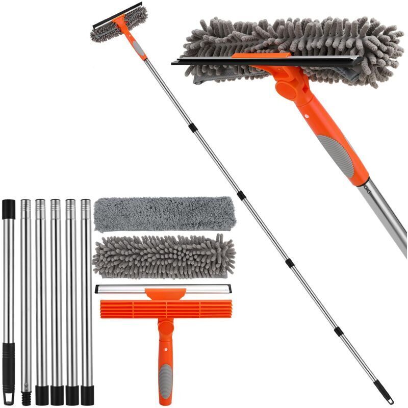 4.5M Raclette Vitre telescopique, 2 in 1 Nettoyeur de vitres télescopique avec Bandes de raclette en Microfibre, Balai télescopique pour vitres Hautes, Murs et Voitures, intérieur/extérieur (Orange)