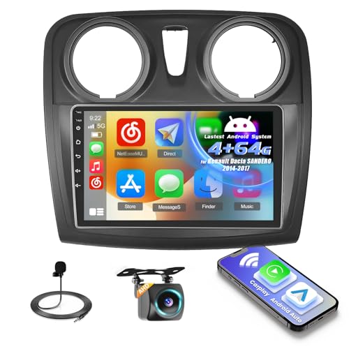 pour Renault, Dacia Sandero 2014-2017, 2+64GB Android Autoradio Wireless Carplay Android Auto 9 Pouces écran Poste Radio Voiture Bluetooth avec GPS, Caméra de Recul, FM RDS Radio, WiFi, EQ