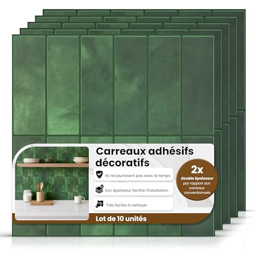 AMARA DECO - 10 Pièces Carrelage Adhésif Mural Salle de Bain & Cuisine 30x30cm. Crédence Adhésive pour Cuisine, Effet Carrelage Authentique 3D, Résistant à la Chaleur et Facile à Nettoyer (10, Vert)