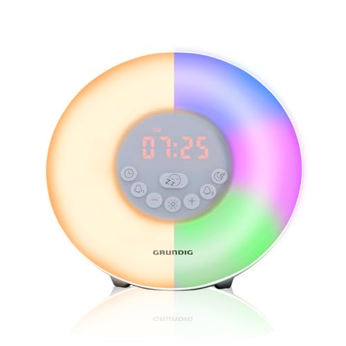 Grundig Réveil Lumineux avec Radio FM - Lampe Réveil avec Simulation d'Aube - 10 Sons Naturels et Éclairage LED Coloré - Fonction Snooze et Minuterie, Blanc