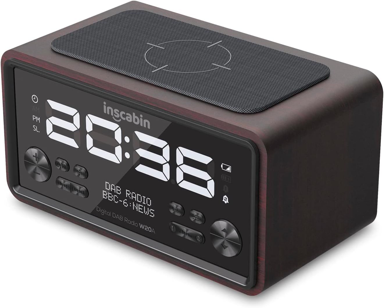 Inscabin W20A - Radio réveil numérique DAB/DAB+ FM avec chargement sans fil/grand écran - Haut-parleur portable sans fil avec Bluetooth - Beau design pour chambre à coucher, cuisine, bureau - Noyer