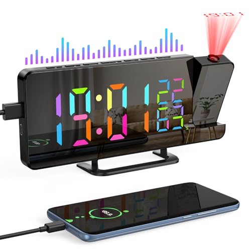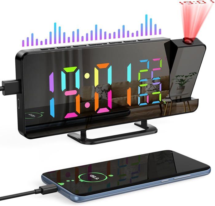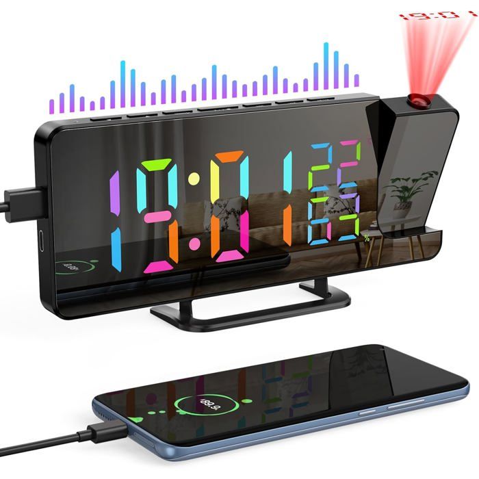 Radio Reveil Projecteur Rgb Réveil Projection Plafond 4 Luminosités Réglable Minuterie Fm Snooze Ecran Miroir Port Usb A Réveil