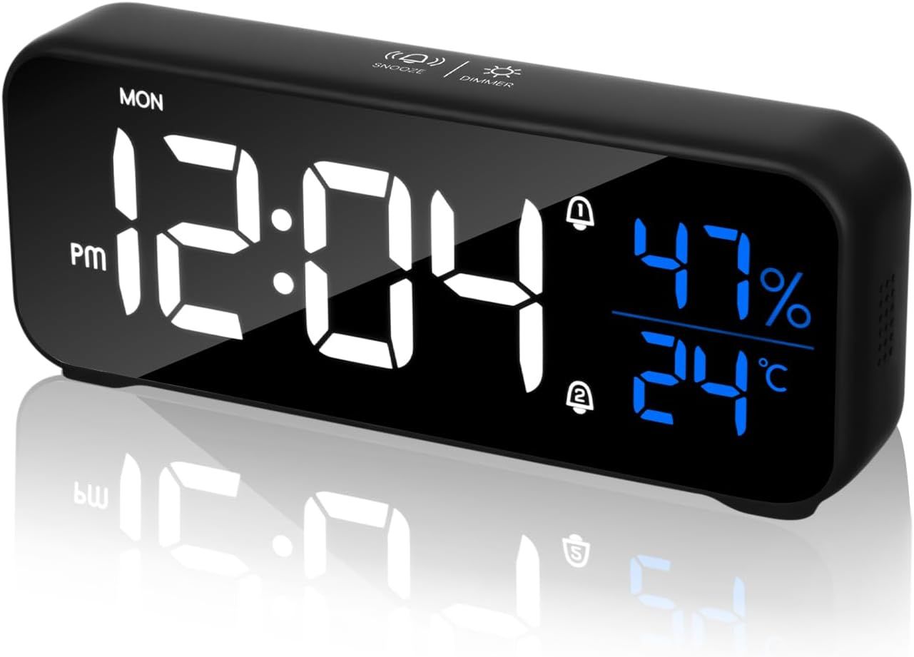 kaacly Radio Réveil avec Double Écran LED, Réveil Numérique de Chevet avec Température et Humidité Réglables, Reveil Matin avec 2 Alarmes, Snooze,Luminosité Réglable,12/24h,Horloge Digitale Port USB