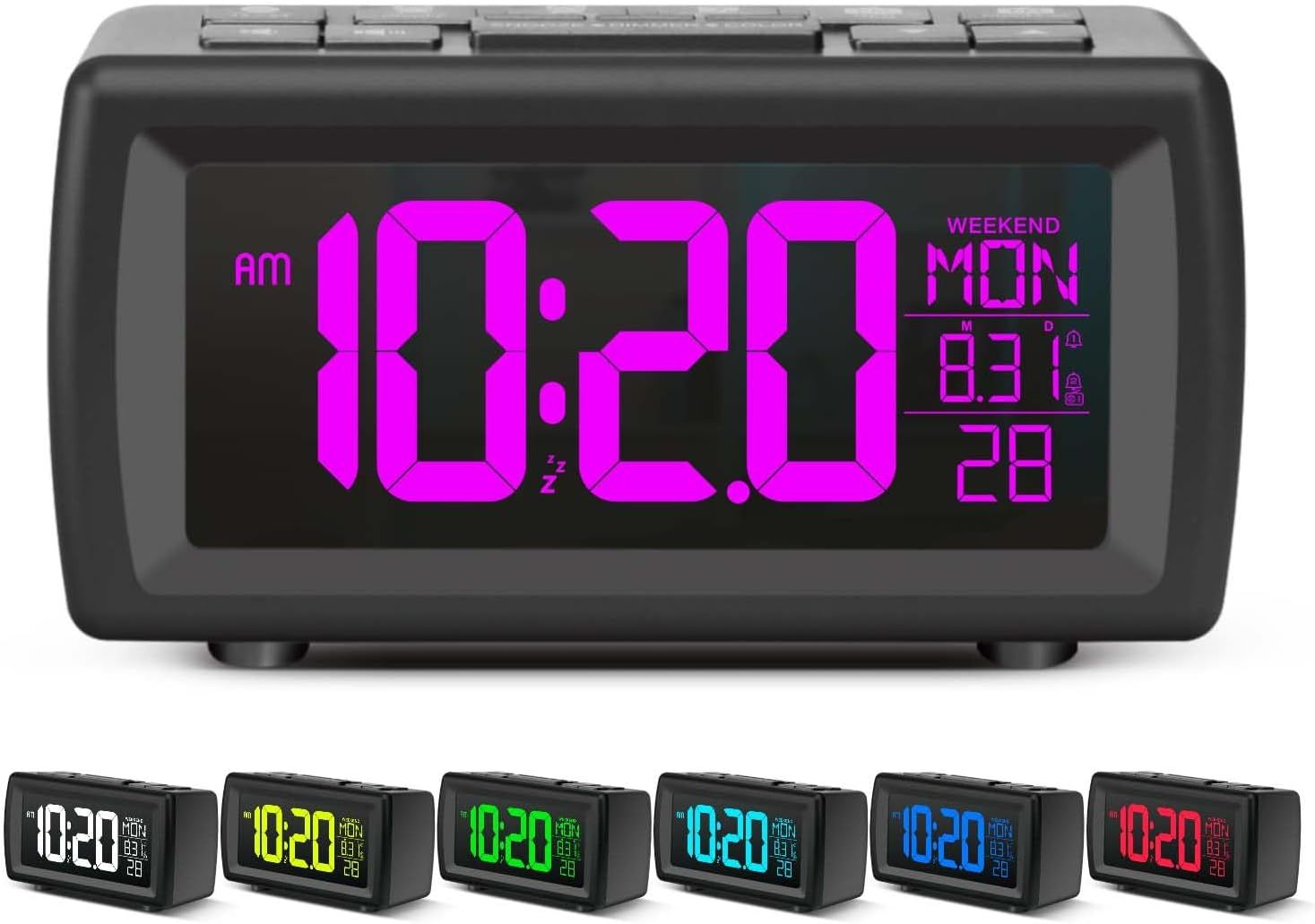 OWYELO Réveil Matin Multifonctions, avec Fonction FM Radio et Double Alarme, Reveil Numérique LED avec Numéros Personnalisés en Sept Couleurs, Snooze, 12/24H, Port USB, Décoration Moderne