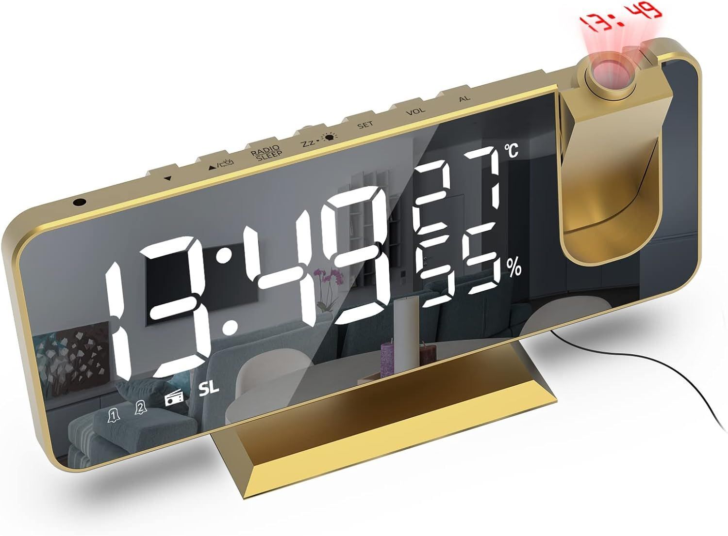 Reveil Projecteur,Radio Réveil avec Température,Humidité,Ecran LED Miroir de 7,5 Pouces,Snooze Double Alarme,4 Luminosité de L'écran avec Fonction de Gradation Automatique,Port de USB (Or)