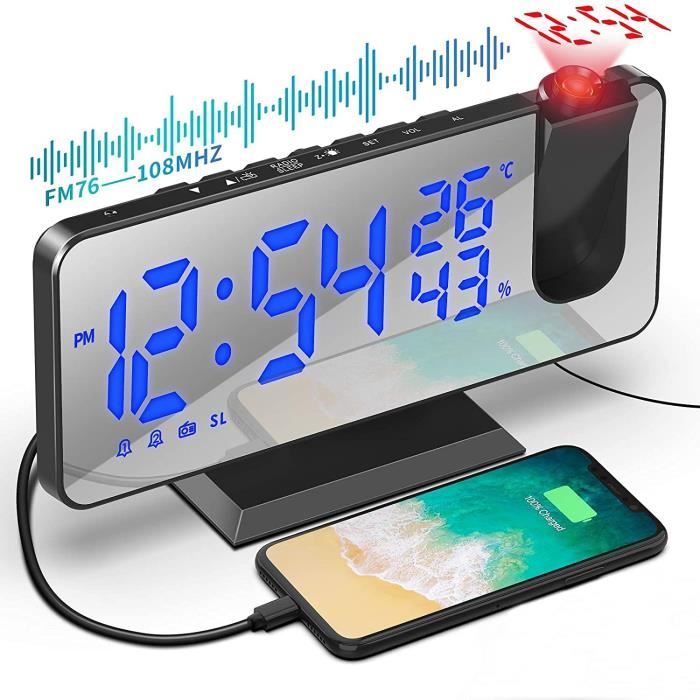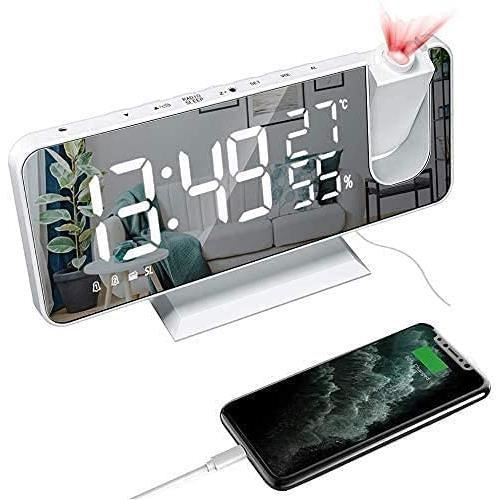 Réveil à projection Réveil numérique LED avec projection à 180 ° Radio réveil avec port USB Grand affichage LED Snooze Double alarme 4 niveaux de luminosité avec variateur automatique