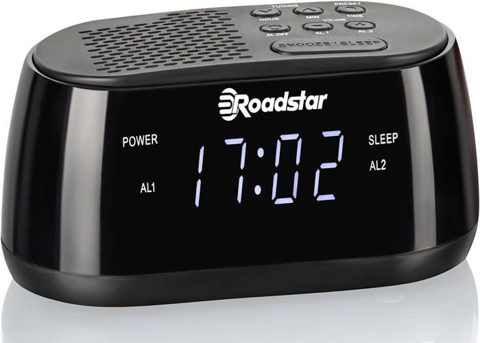 Roadstar CLR-2477 Radio-Réveil Numérique FM, Port USB à Chargement Rapide, 2 Alarmes, Grand Écran LCD, Fonction Snooze, Minuterie d'Arrêt, Noir