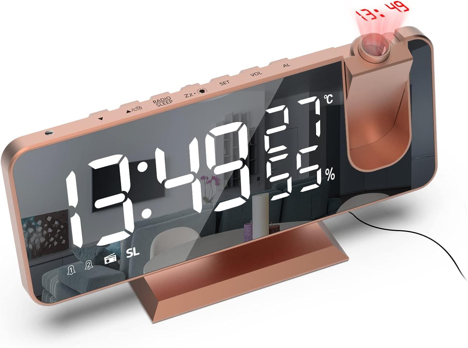 Reveil Projecteur,Radio Réveil avec Température,Humidité,Ecran LED Miroir de 7,5 Pouces,Snooze Double Alarme,4 Luminosité de L'écran avec Fonction de Gradation Automatique,Port de USB (Or rose)