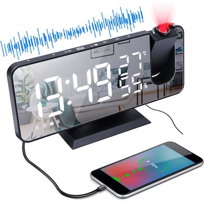 Radio réveil Projecteur 180° - avec FM 2 Alarmes Snooze Charge USB Réveil Numérique LED Écran Miroir 4 Niveaux de Luminosité 12/24H