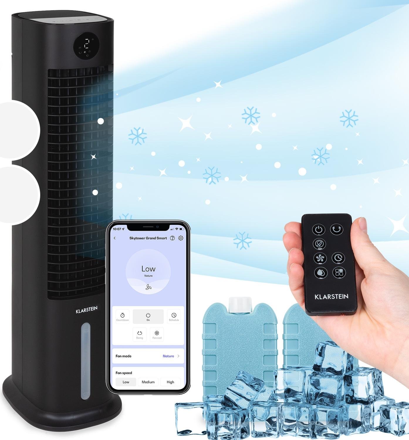 Klarstein Skytower Grand Smart Rafraîchisseur d'Air – 4-en-1 Ventilateur, Humidificateur & Purificateur, 480 m³/h, Wi-Fi & App Control, 8L Réservoir, Silencieux, Oscillation, Idéal pour Maison, Noir