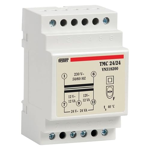 VEMER VN318200 TMC 24/24 - Transformateur 24V pour Service Continu, Tension Primaire 230V, Tension Secondaire 12-24V, Puissance 24VA, Installation sur Rail Din, Blanc