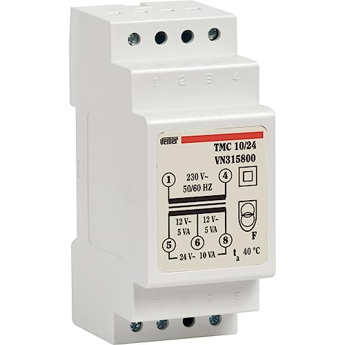 VEMER VN315800 TMC 10/24 - Transformateur 24V pour Service Continu, Tension Primaire 230V, Tension Secondaire 12-24V, Puissance 10VA, Installation sur Rail Din, Blanc