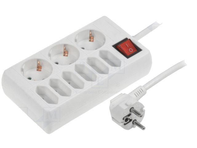 Multiprise blanche avec rallonge 5m - parafoudre - 7 prises 230VAC 16A - IP20 - SCHUKO