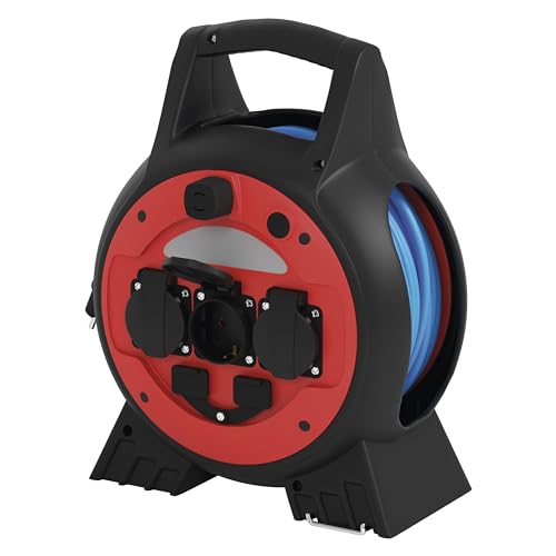 EMOS Enrouleur de câble d'extérieur toute l'année avec lumière LED et 2 sorties USB, rallonge bleue de 1,5 mm², 20 m, 3 prises Schuko avec couvercles à rabat, IP44 étanche et résistant au gel pour