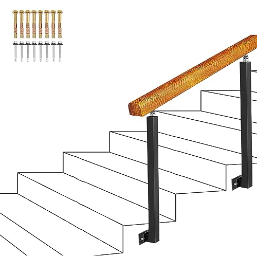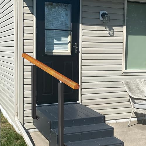 Rambarde pour escalier extérieur, Compatible avec 3 ou 4 marches, Rampe d'escalier en Bois avec poteaux en Fer forgé Noir, Rampe de Style transitionnel pour escaliers en béton ou en Bois (C