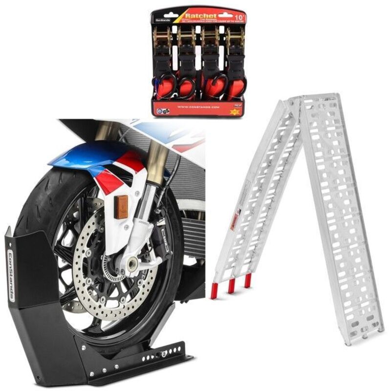 rampe de chargement en Alu max. 340 kg pliable + Set béquille cale de roue moto avant av. Sangles de cliquet Easy Plus