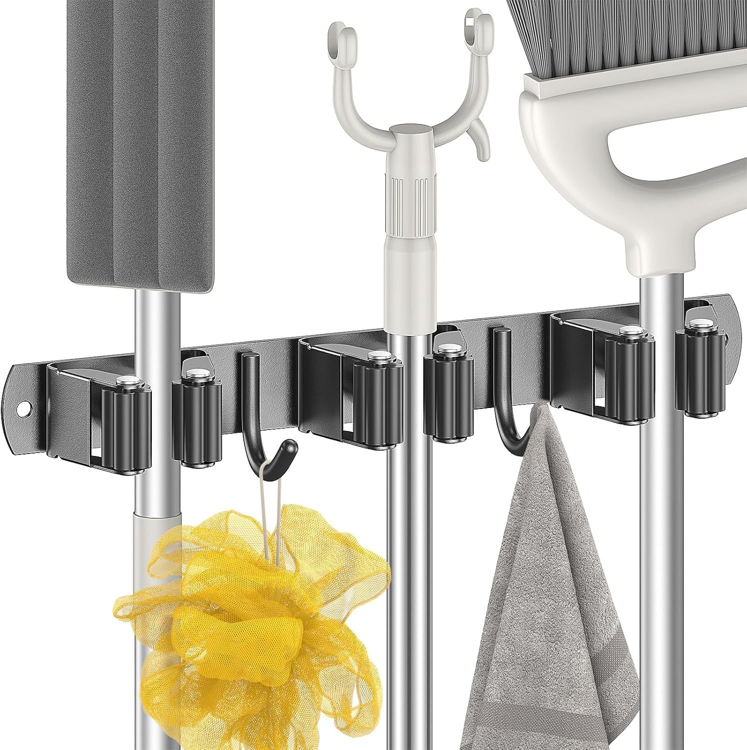 HSUYUN Range Balai Mural, Autocollant Porte Balais Mural, Gris Support Balai, Pas de Perçage Nécessaire, 4 Clips et 5 Crochets Support Mural Balai, pour la Cuisine, le Garage, le Jardin, le Balcon