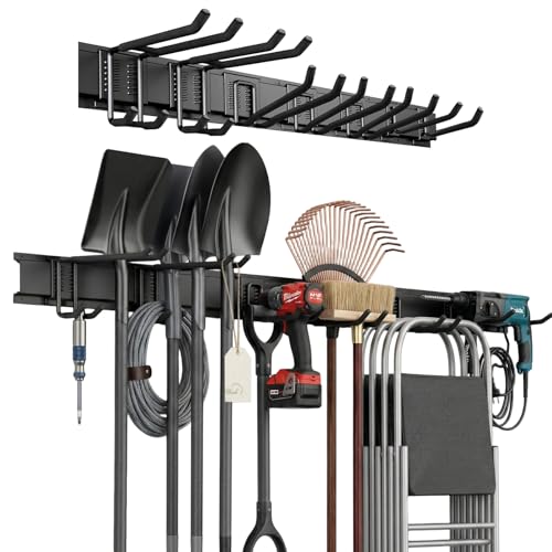 Ribech Range-mural pour Outils de Garage – Rail de Rangement 122 cm avec 10 Crochets (3 Types), Crochets Caoutchoutés, Capacité 227 kg, pour Outils de Jardin, Skis, Balais, Pelles – Fixation Murale