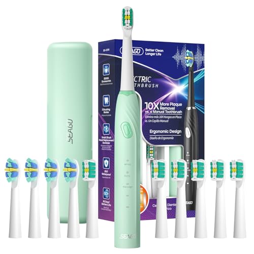 seago brosse à dent électrique sonique, brosse a dent electrique 60 jours d'autonomie avec 10 têtes de brosse et étui de voyage, minuterie 2 min, brosses à dents ultrasoniques,Vert