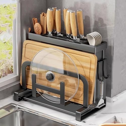 Porte-Couvercles et Organiseur de Cuisine Multifonction | Support avec Porte-Couteaux Range-Ustensiles et Bac à Égouttage | pour Planche et Cuillères Économiseur d‘Espace(Black,A)