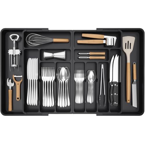 Lifewit Range Couverts pour Tiroir de Cuisine, Rangement Couvert Extensible et Ajustable, Support de Rangement en Plastique pour Couverts, Cuillères, Fourchettes, Couteaux, Noir